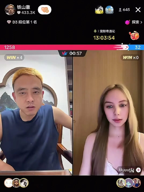 回望铁山靠的崛起之路,不折不扣的草根出身,早期靠着哥们义气的段子在快手确立了自己的风格,但快手咱们都知道,哥们义气、荣华富贵、谈天说地在这里是最不值钱的,卷不出效果铁山靠开始转型直播PK。